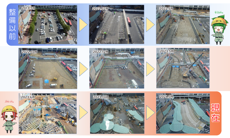 万代広場の全面供用は2027年春を目標に整備を進めています。なお、広場整備にあたっては、既存の施設配置(バス乗降場、タクシーのりば等)や利用者動線を変更しながら、段階的に整備を進めていきます。今後の整備スケジュールと各段階における施設配置(利用動線を含む)など、下記リンク先動画にて詳しく紹介しております。